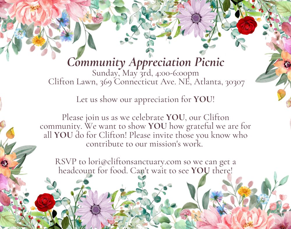 Clifton Ministries Community Appreciate Picnic Posted on April 17, 2026April 17, 2026 by Nancy Sunday May 3rd, 4-6pm on the Clifton Lawn, 369 Connecticut Ave. RSVP to lori@cliftonsanctuary.com