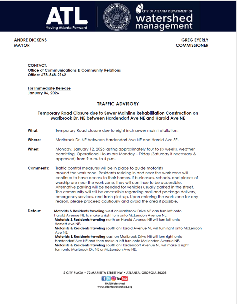 On behalf of DWM, Rockdale Pipeline is planning a full road closure of Marlbrook Dr NE between Hardendorf Ave NE and Harold Ave NE. The closure will be from 01/12/2026 to mid-February to allow for installation of a new sanitary sewer main and lateral. While work will be completed between 9:00 am and 4:00 pm, a 24-hour road closure is required due to the location and type of work. The Traffic Control Plan is provided below.